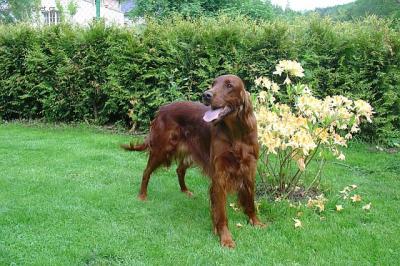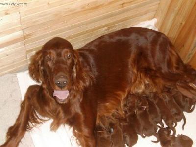 Irský setr - vznikl po specializaci barev setrů kolem poloviny předminulého století z bíločervených setrů, chovaných převážně v Irsku.Výběrem převážně červených psů byl vyšlechtěn celočervený irský setr, jak ho známe dnes. Je to elegantní, ušlechtile stavěný pes s vysoce vyvinutými loveckými vlohami. Neobyčejně silně vyvinutý lovecký pud bývá příčinou těžší ovladatelnosti, ale důsledným výcvikem se z irského setra stane skutečně jedinečně upotřebitelný lovecký pes s vlohami pro všestranou práci, zejména s vrozenou ochotou pro vodní práci a přinášení. Od doby, kdy byl irský setr představen na výstavách psů, získal si stále rostoucí oblibu i u těch milovníků psů, kteří se nijak nezabývají lovem či myslivostí. Nápadná sytá mahagonově červená barva dlouhé splývavé srsti s nafialovělým kovovým leskem, vznosná postava a aristokratická ušlechtilost celkového zjevu činí z irského setra pravého elegána mezi všemi plemeny psů vůbec. Důležitou roli hraje také jeho milá, oddaná a něžná povaha. Lidé jsou přímo fascinováni oduševnělostí pohledu tohoto červeného Ira. Pravdou je , že při pohledu do zářících očí setra se do něj musíme jednoduše zamilovatt. Irský setr potřebuje však jako svého pána rozumnou osobu, která bude mít dostatek času,aby dokázala vyhovět jeho potřebám. Má-li se psovi tohoto plemene opravdu dařit dobře, musí si být jist, že je milován a že ho jeho lidé potřebují.