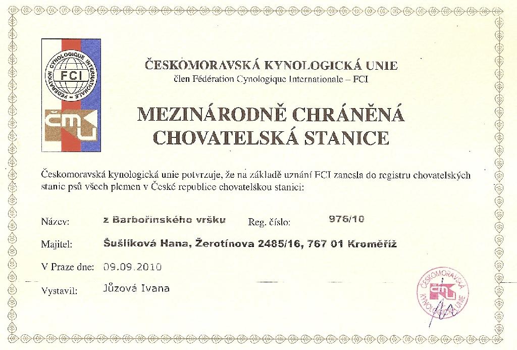 Adresa: Žerotínova 2485, Kroměříž 76701 Telefon: +420 739 614 118 Zodpovědná osoba: Kateřina Šušlíková www: z-barborinskeho-vrsku.wz.cz Mail: | Reg. číslo CHS: 976/10 Certifikát CHS: Zobrazit Certifikát ::: Plánujeme vrh: 01.01.1970 Hodnocení: 82 bodů ze 100 |