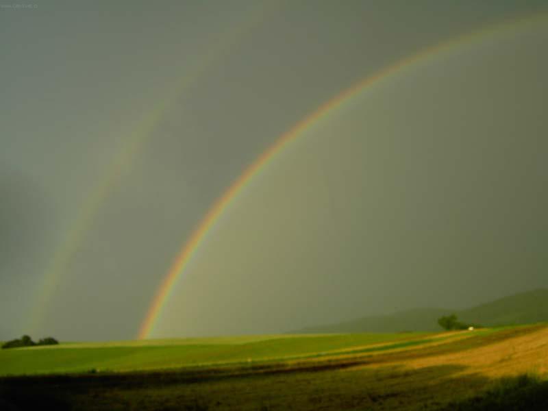 dvě duhy nad krajinou po dešti